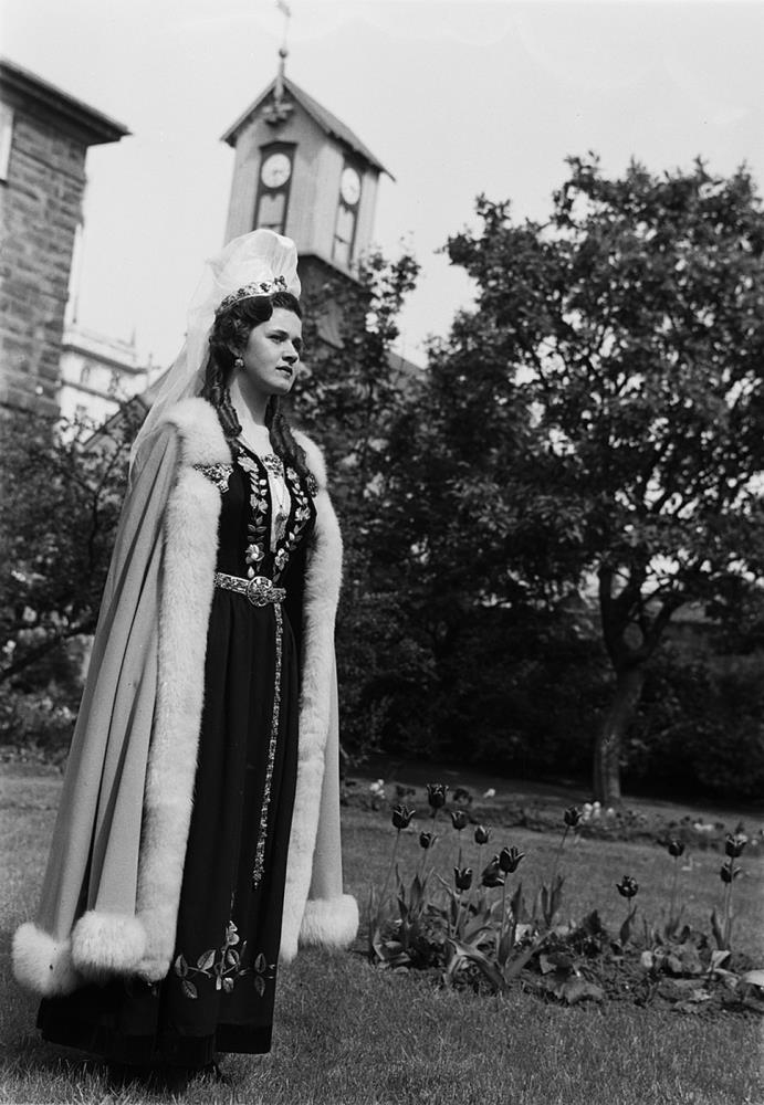 Alþingisgarður. Reykjavík. Kona í skautbúningi í garði. Gerður Hjörleifsdóttir leikkona sem var fjallkona þetta ár. 17. júní 1954. Sjá Tíminn 19. júní 1954.