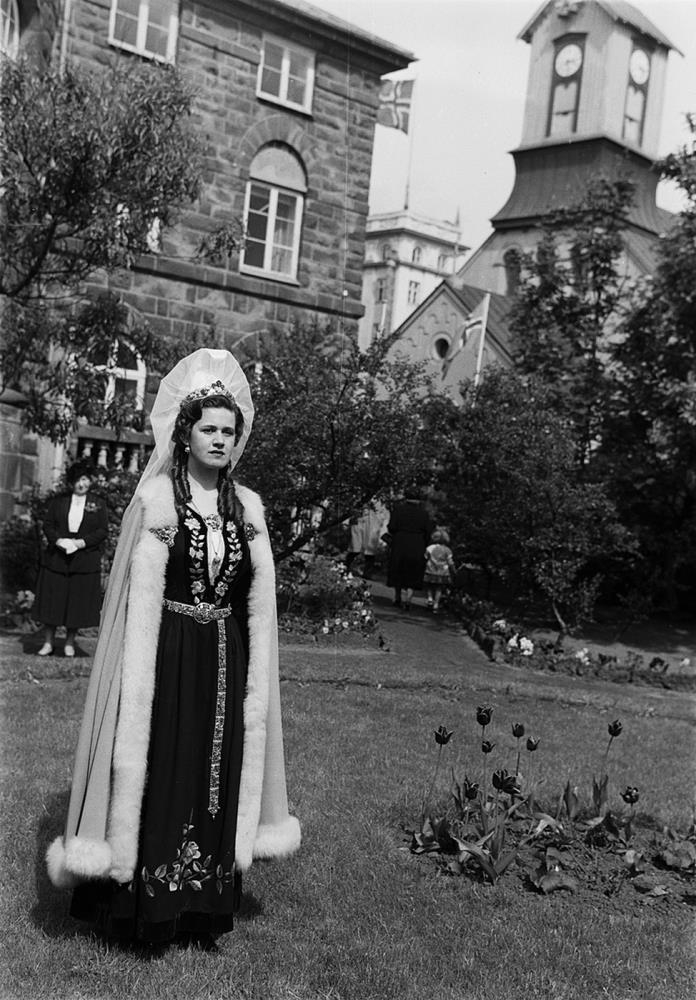 Alþingisgarður. Reykjavík. Kona í skautbúningi í garði. Gerður Hjörleifsdóttir leikkona sem var fjallkona þetta ár. 17. júní 1954. Sjá Tíminn 19. júní 1954.