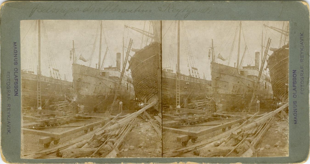 „Myndin er tekin 1904-6, líklega 1904. Til vinstri sést kútter Egill RE 17 og skipið í miðið er gufubáturinn Reykjavík, norskt skip sem annaðist strandsiglingar við Faxaflóa 1897 uns það rak upp við Batteriið 20. febrúar 1907. Endurbættur slippur var tekin í notkun 1904 og var Reykjavíkin talin hafa verið fyrsta skipið til að vera tekin þar upp. Um það leiti var Egill endurbyggður af slippfélaginu.“ (BÞ 2016)