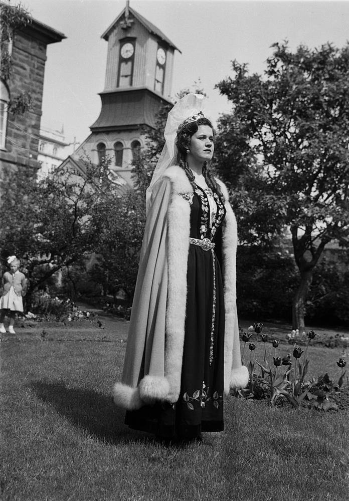 Alþingisgarður. Reykjavík. Kona í skautbúningi í garði. Gerður Hjörleifsdóttir leikkona sem var fjallkona þetta ár. 17. júní 1954. Sjá Samvinnan júní 1954 en þar birtist myndin á forsíðu spegluð.