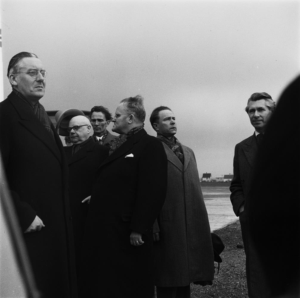 Reykjavíkurflugvöllur. Prúðbúnir karlmenn. Hér má þekkja Vilhjálm Þ. Gíslason og Guðlaug Rósenkranz. Finnskur óperuflokkur kemur til landsins ávegum Þjóðleikhússins. Sjá Tíminn 7.maí 1953.