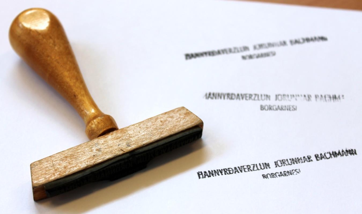 Á stimplinum stendur "Hannyrðaverzlun Jórunnar Bachmann, Borgarnesi".