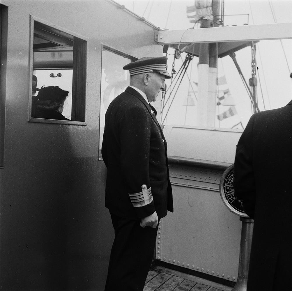 Reykjavíkurhöfn. Maður í einkennisbúningi með kaskeiti í skipsbrú. Pétur Björnsson skipstjóri. Koma nýs skips með heitinu Goðafoss til Íslands 1948. Sjá Tíminn 24.mars 1948.