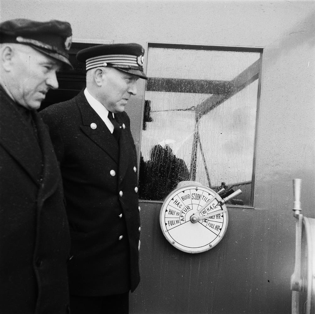 Goðafoss. Tveir menn við stjórntæki. Til hægri er Pétur Björnsson skipstjóri. Koma nýs skips með heitinu Goðafoss til Íslands 1948. Sjá Tíminn 24.mars 1948 en myndhluti birtist með þessum texta: Pétur Björnsson skipstjóri á Goðafossi. Myndin er tekin er hann siglir skipinu í fyrsta sinn inn í Reykjavíkurhöfn.