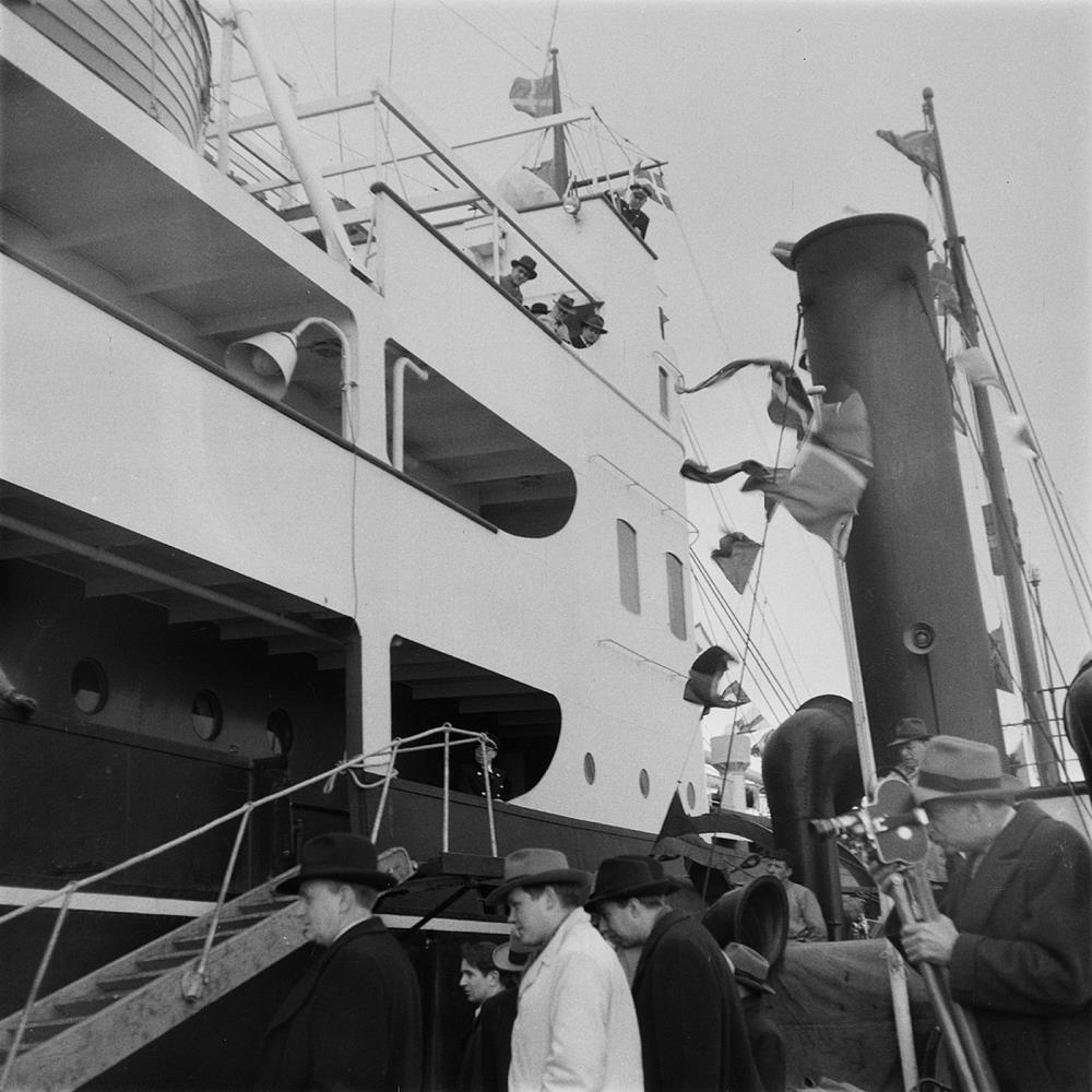Reykjavíkurhöfn. Maður með kvikmyndavél og fleiri karlar við landgang millilandaskips. Goðafoss. Tveir menn við stjórntæki. Til hægri er Pétur Björnsson skipstjóri. Koma nýs skips með heitinu Goðafoss til Íslands 1948. Sjá Tíminn 24.mars 1948.