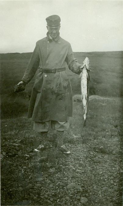 Maður í frakka með derhúfu í pokabuxum og strigaskóm heldur á laxi . Ein sex mynd á spjaldhlið á blaði úr albúmi.