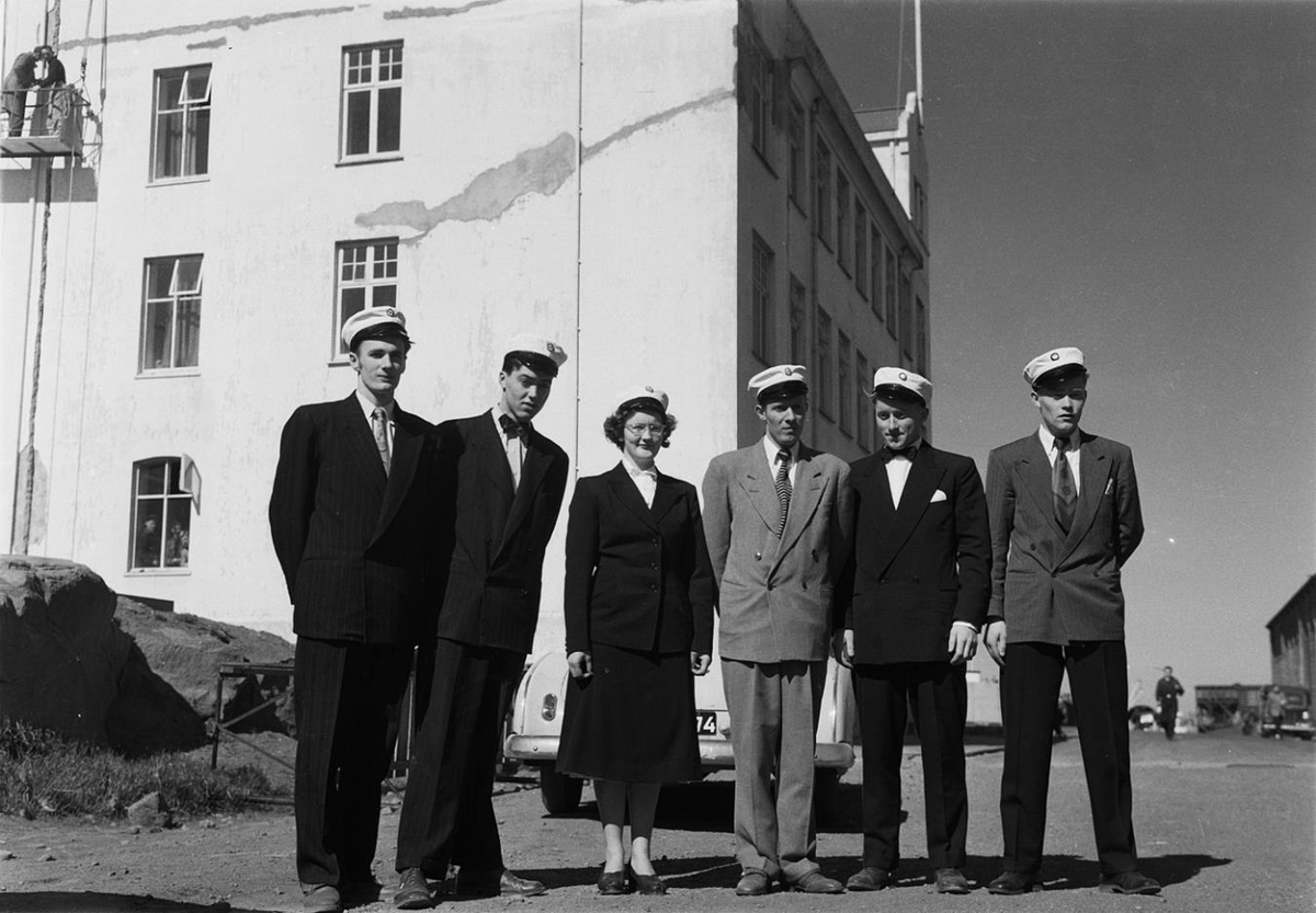 Sambandshúsið. Fimm karlar og ein kona uppáklædd með stúdentshúfur. Fyrstu stúdentar frá Menntaskólanum á Laugarvatni 1952: Erling Tómasson, Ásgeir Svanbergsson, Ingibjörg Bergþórsdóttir, Elís Guðnason, Teitur Benediktsson og Einar Þorsteinsson. Sjá Tíminn 17. júní 1952.