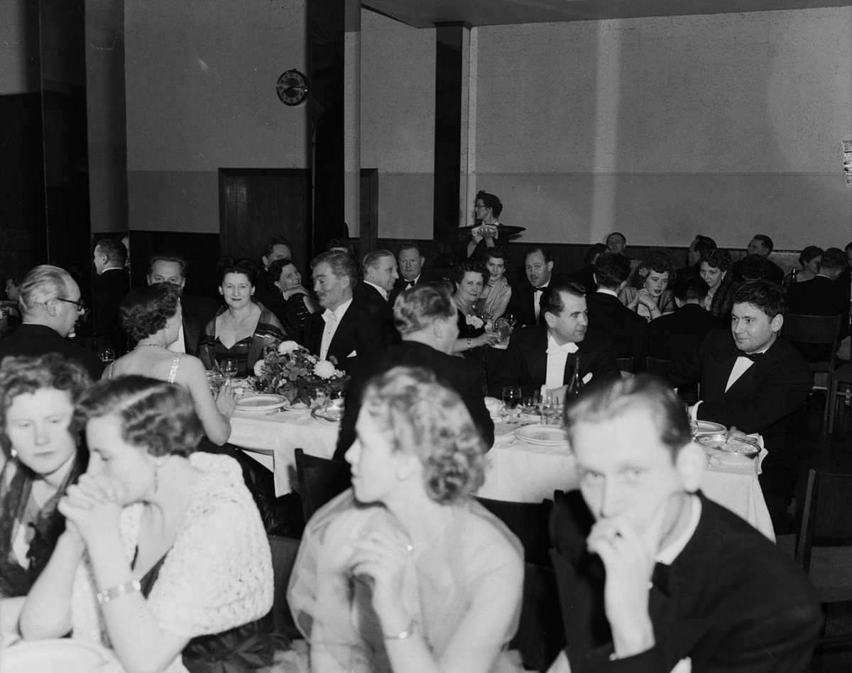Sjálfstæðishúsið. Austurvöllur. Reykjavík. Veisla með borðhaldi. Spariklætt fólk situr til borðs. Þekkja má Jón S. Ólafsson lögfræðing- annan frávinstri við annað borð. Hátíð á vegum Stúdentafélags?