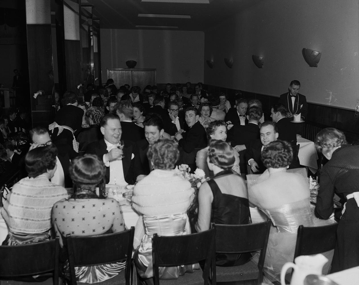 Sjálfstæðishúsið. Austurvöllur. Reykjavík. Veisla með borðhaldi. Spariklætt fólk situr til borðs. Þekkja má Brynjólf Ingólfsson lögfræðing og Jónas Kristjánsson handritafræðing í hópnum. Hátíð á vegum Stúdentafélags?