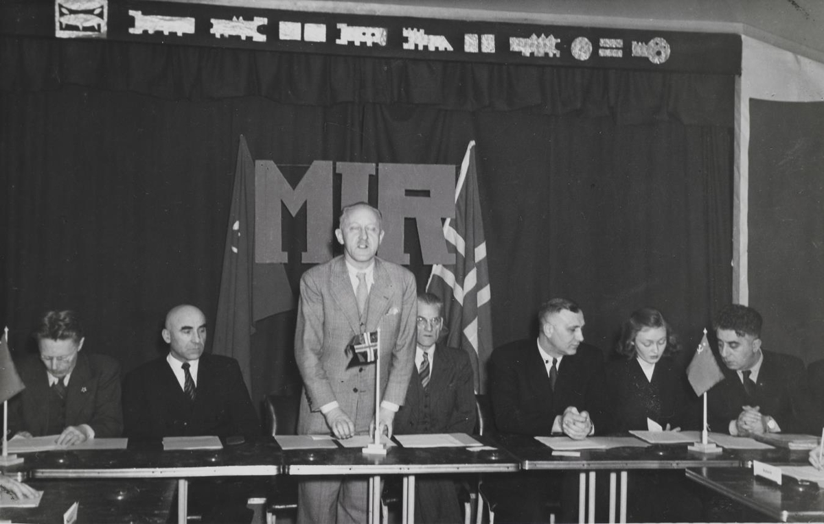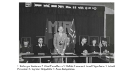 Mynd frá fyrsta ársþingi MÍR í mars 1951, sem haldið var í tilefni af komu fyrstu sovésku sendinefndarinnar til Íslands. Halldór Laxness stendur fyrir miðju á myndinni, en hann var forseti MÍR á þessum tíma. Honum á vinstri hönd eru Þórbergur Þórðarson, sem var varaforseti, og Gúsév sendiherra Sovétríkjanna á Íslandi. Honum á hægri hönd eru Ársæll Sigurðsson, stjórnarmaður í MÍR, Arkadí Perventsév, rithöfundur og formaður sendinenfdarinnar, Sigríður Helgadóttir, túlkur og Aram Khachaturian, tónskáld.