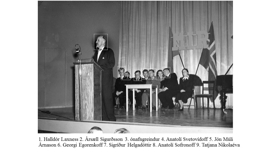 Á myndinni eru frá vinstri: Halldór Laxness í pontu, Ársæll Sigurðsson, Anatoli Svetovidov fiskifræðingur, Jón Múli Árnason, Gerogi Egorenkoff bílaverkfræðingur, Sigríður Helgadóttir, Anatoly Sofronov skáld og formaður sendinefndarinnar og Tatiönu Nikoayevu píanóleikari og tónskáld sem hélt tónleika í Austurbæjarbíói þegar hún var hér á landi með sendinefndinni.