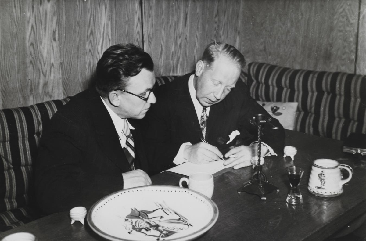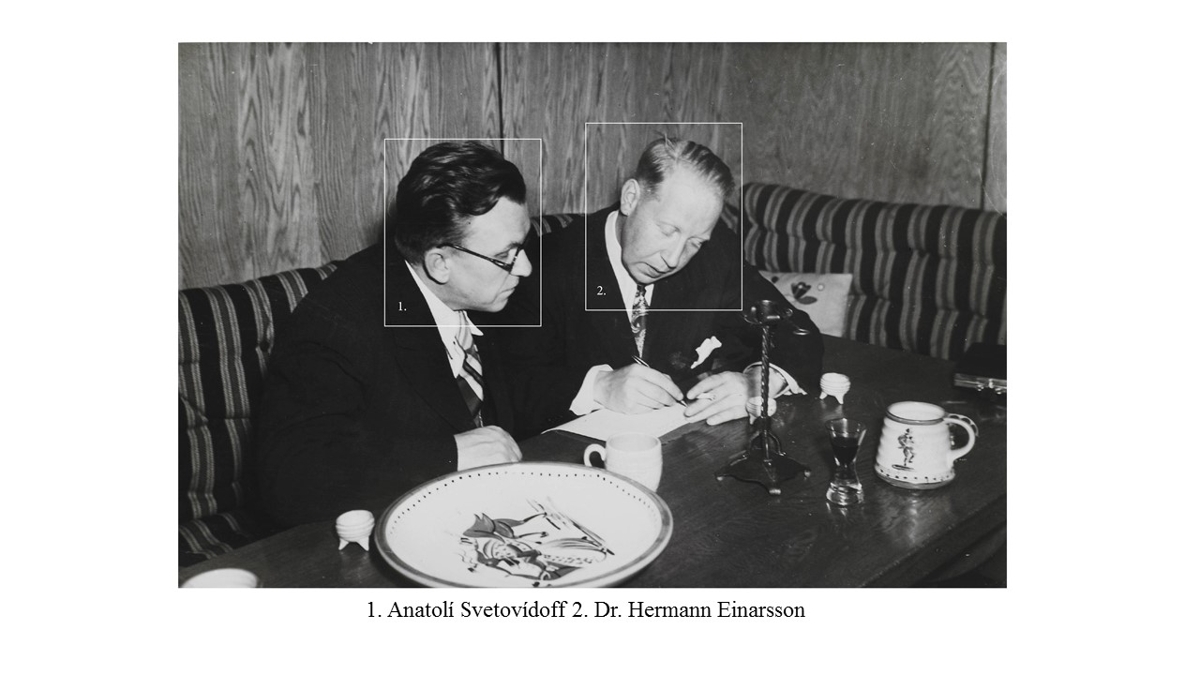 Fiskifræðingarnir Anatoli Svetovidov og Dr. Hermann Einarsson ræða saman í stofunni á Gljúfrasteini.