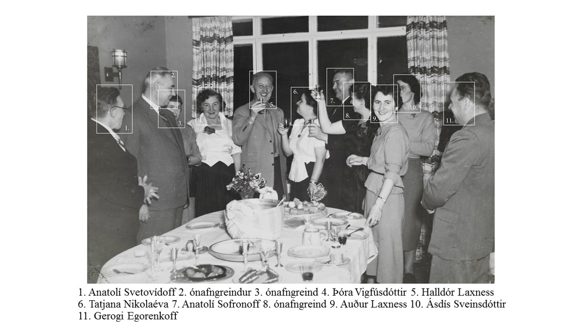 Frá vinstri: Anatoli Svetovidov, ónafngreindur maður (mögulega sendiherra) ónafngreind kona, Þóra Vigfúsdóttir, Halldór Laxness, Tatiana Nikolayeva, Anatoly Sofronov, ónafngreind kona (mögulega sendiherrafrúin), Auður Laxness, Ásdís Sveinsdóttir og Georgi Egorenkoff.