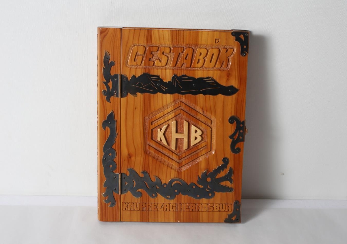 Gestabók úr íslensku lerki með merki KHB úr birki innfelldu á forsíðu. Lamir handunnar úr brenndum kopar. Efri lömin er mynd af Dyrfjöllunum en neðri lömin er Lagarfljótsormurinn. Efst á forsíðu er skorið "Gestabók" og neðst "Kaupfélag Héraðsbúa". Á kjöl er útskorið með höfðaletri "Gestabók".