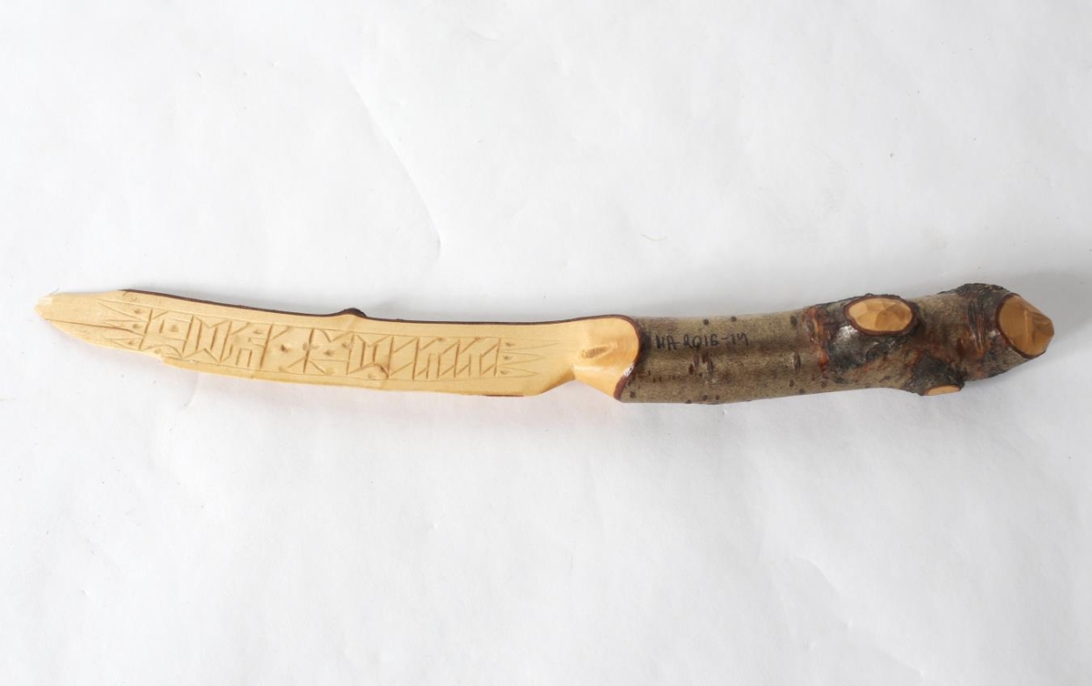 Blaðahnífur úr birkigrein. Á blaðinu stendur "Þorsteinn" með höfðaletri á annari hliðinni og hinni "MCMLXXVII".