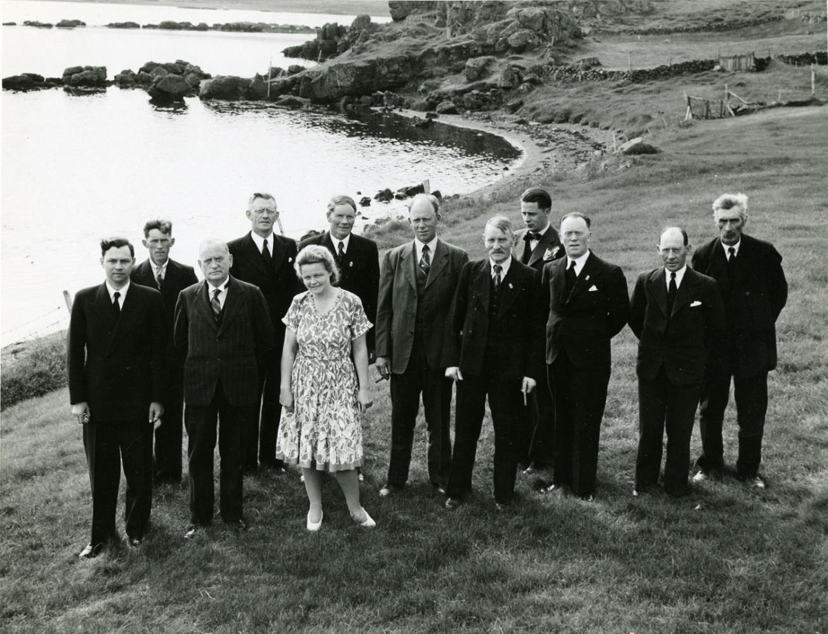 „Sveinn kom í heimsókn til Hólmavíkur 6. ágúst 1944. Í Tímanum segir föstudaginn 11. ágúst 1944: "Til Hólmavíkur kom forsetinn á sunnudag. Jóhann Salberg Guðmundsson sýslumaður og sýslunefndarmenn Strandasýslu tóku á móti honum og skátar stóðu heiðursvörð á bryggju. Var haldið heim til sýslumanns. Þar ávarpaði hann forseta, en hann þakkaði. Var síðan setzt að kaffidrykkju og flutti séra Jón Guðnason ræðu undir borðum. Áður en forseti steig aftur á skipsfjöl hylltu menn hann, en sýslumaður flutti honum kveðjuorð."Frá vinstri: 1) Jóhann Salberg Guðmundsson sýslumaður, 2) Alfreð Halldórsson í Stóra-Fjarðarhorni, 3) Sveinn Björnsson forseti 4) Séra Jón Guðnason á Prestbakka, 5) Sesselja Helga Jónsdóttir (kona Jóhanns sýslumanns), 6) Guðbrandur Björnsson Heydalsá, 7) Ólafur Einarsson á Þórustöðum, 8) Sigvaldi Guðmundsson á Sandnesi, 9) Pétur Eggerz forsetaritari, 10) Hjálmar Halldórsson Hólmavík, 11) Ormur Samúelsson Hólmavík og 12) Magnus Steingrímsson Hólum í Staðardal.“ (JJ 2016)