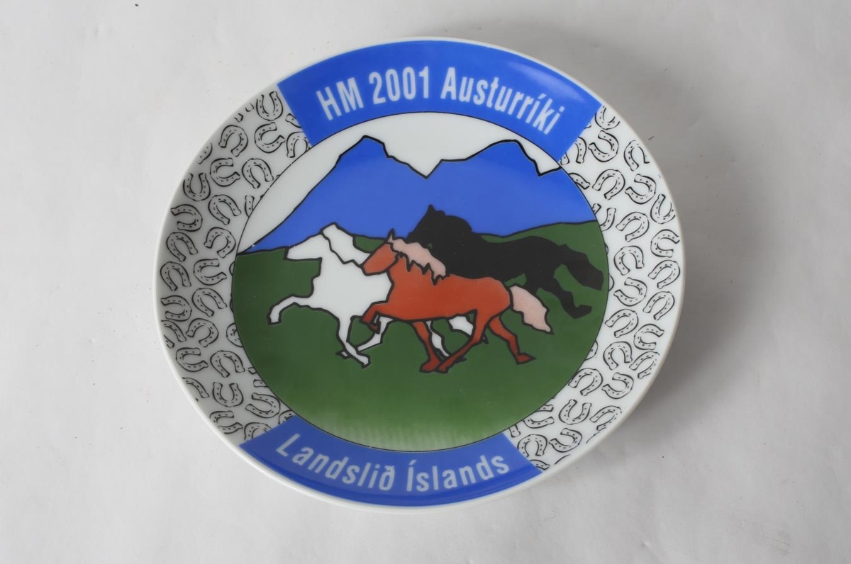 Hvítur postulínsplatti gerður í tilefni HM 2001 í Austurríki. Efst á plattanum er blár flötur með hvítum stöfum "HM 2001 Austurríki". Myndin er af bláum fjöllum og grænu túni fyrir neðan þar sem þrír hestar (hvítur, brúnn og svartur) eru að hlaupa. Á neðri hlutanum er blár flötur með hvítum stöfum sem á stendur "Landslið Íslands". Til hliðar er hvítur grunnur með svörtum skeifum. Aftan á plattanum stendur "Hönnun: Helga Jóhannesdóttir leirlistakona Álafossi í Mosfellsbæ - Leir og Postulín - sími 552-1194".
