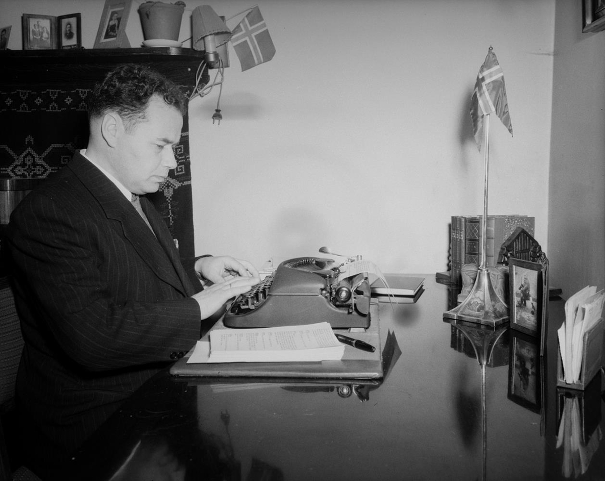 Maður situr við skrifborð framan við ritvél. Loftur Guðmundsson rithöfundur.