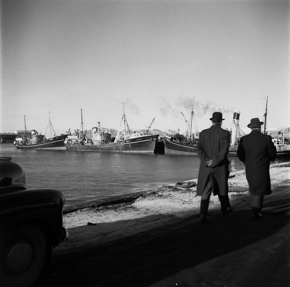 Reykjavíkurhöfn. Tveir frakkaklæddir menn að ganga niður bryggju. togarar við Faxabryggju fjær. Þeir eru f.v. Geir RE 141, Elliði SI 1 og Tryggvi gamli RE 2.