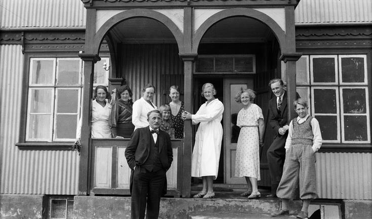 Hópur fólks á yfirbyggðum tröppum. Bjarni Benediktsson gestgjafi og börn. Gunnar Bjarnason ráðunautur annar f.h. Filma 7x11.