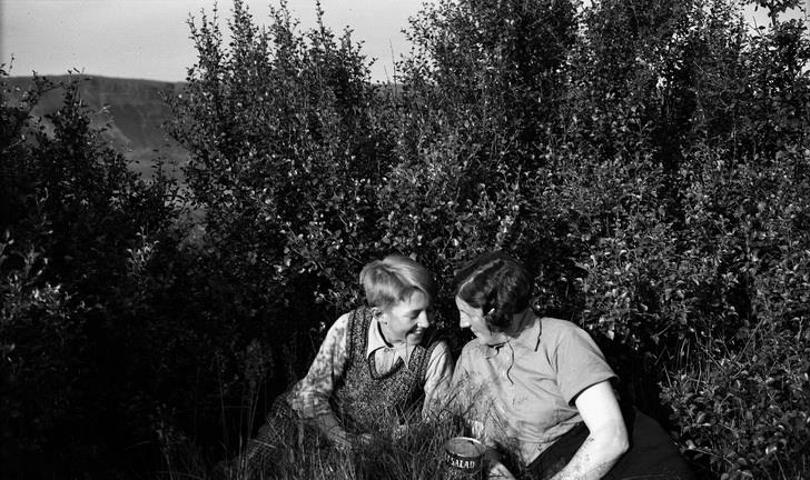 Strákur og kona við kjarrgróður. Arnór Björnsson ? og Guðrún Runólfsína Jónsdóttir. Filma 7x11.