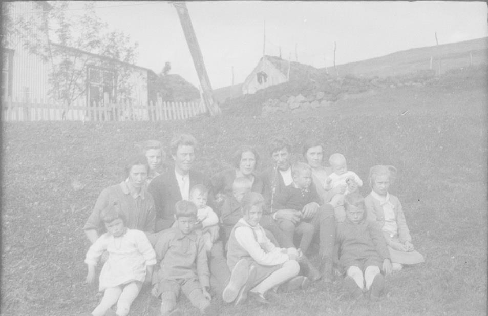 Hópur fólks, hús í bakgrunni. Synir Hallgríms sitja væntanlega sinn hvoru megin neðst eins klæddir.