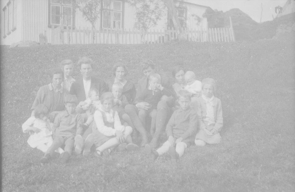 Hópur fólks situr saman, hús sést í bakgrunni. Synir Hallgríms sitja væntanlega sinhvoru megin neðst í alveg eins fötum.