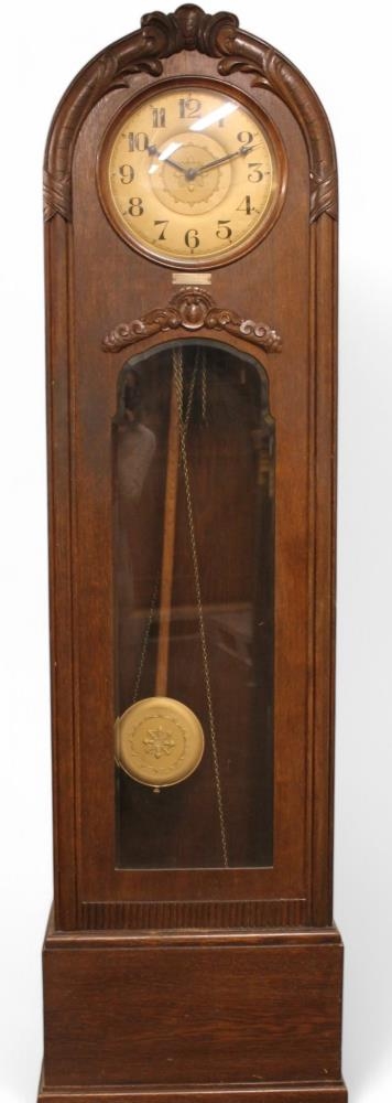 Vegleg standklukka, gólfklukka, heill skápur úr dökkum við ( lituð eik), álímt viðarskraut.