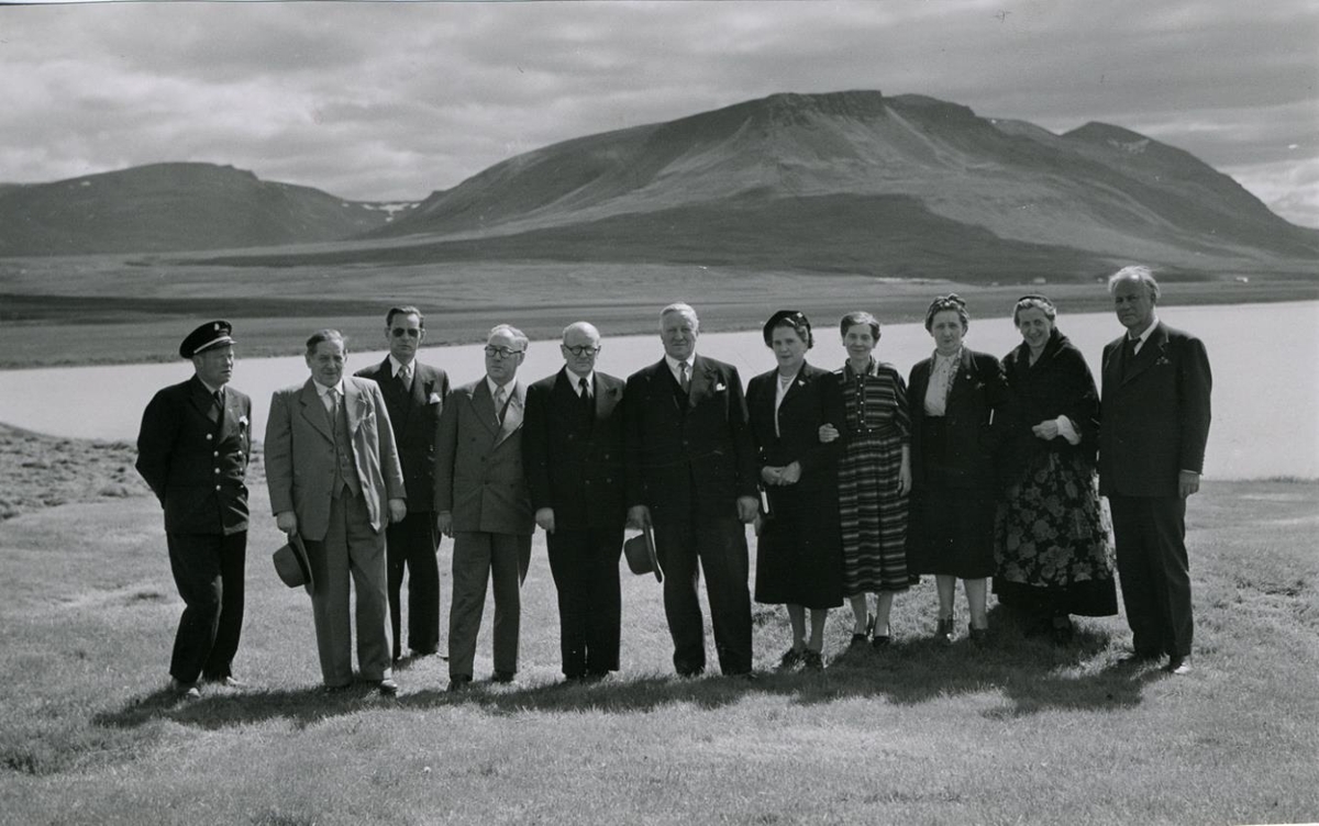 Úr forsetatíð Ásgeirs Ásgeirssonar. A-Húnafvatnssýsla, Myndin tekin frá Akri, Húnavatn og Vatnsdalsfjall í baksýn. Líklega sýslunefnd A-Hún, sýslumaður yst t.v. og forsetahjónin yst t.h.