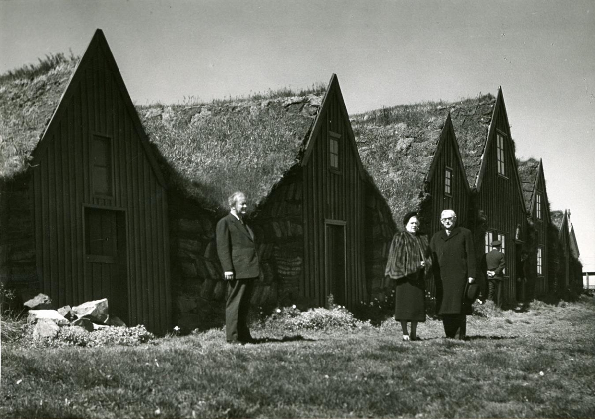 Úr forsetatíð Ásgeirs Ásgeirssonar. Forsetahjónin standa við torfbæinn í Glaumbæ í Skagafirði.
