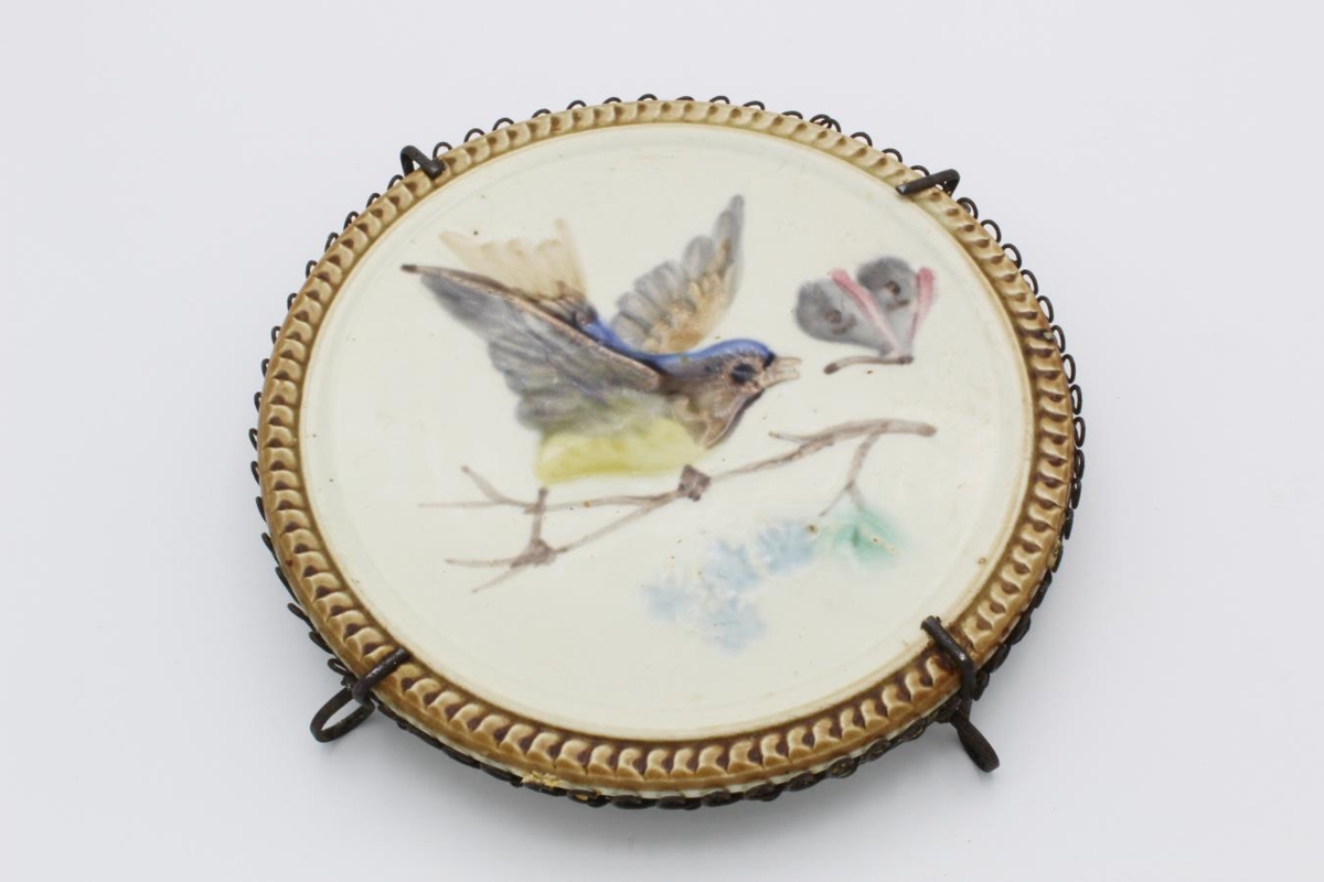 Platti með fuglamynd, 14,4 sm í þvermál, úr keramik, vírfætur. Notaður undir heitt. Gefandinn Ásta Ólafsdóttir ólst upp í Gunnarshúsi á Eyrarbakka með systkinum sínum. Þessi platti er úr því búi. Hinsvegar var alltaf sagt að hann væri úr Húsinu. Skýringin á því hvernig plattinn lenti í Gunnarshúsi er sá líklegastur að eftir að halla fór undan fæti hja íbúum Hússins, Guðmundu og Peter Nielsen voru haldin nokkur uppboð á munum úr þeirra búi (24. okt 1925, 7. maí 1927, 3. nóv. 1927 og 1. okt. 1930) Þannig dreifðust munir úr Húsinu á Eyrarbakka víða.