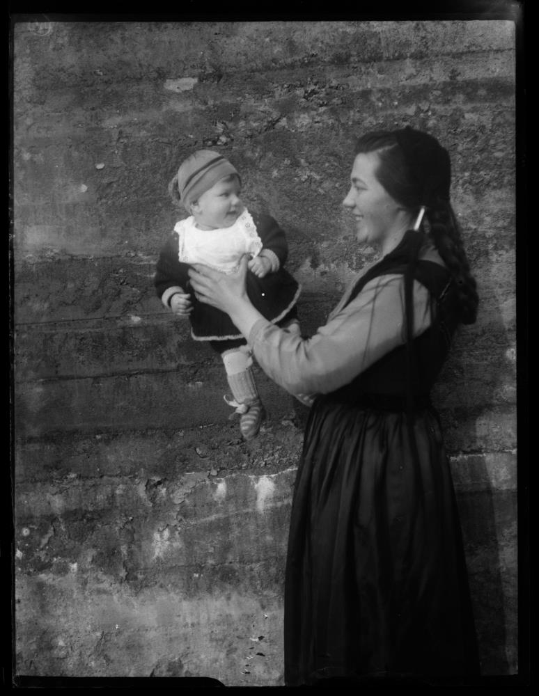 Kona heldur á barni og lyftir því upp. Barnið er með smell með blúndu og í prjónuðum kjól og buxum og sokkum.