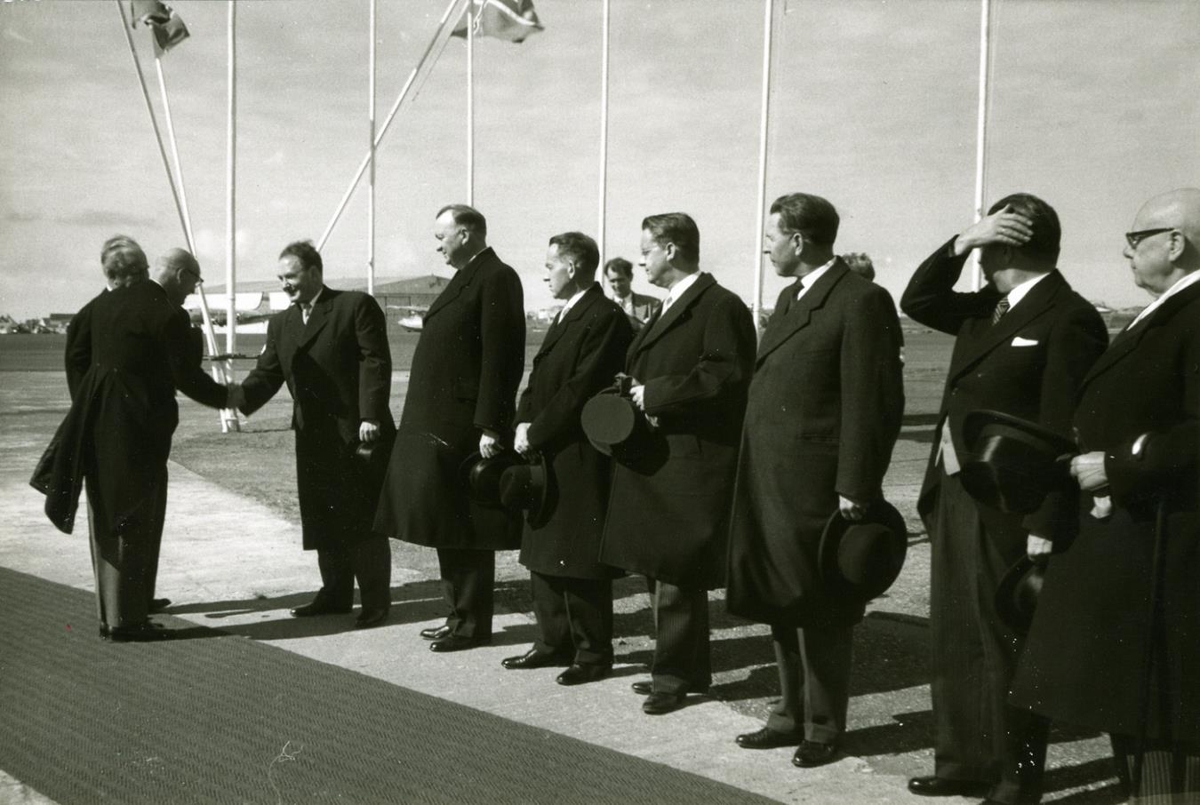 Úr forsetatíð Ásgeirs Ásgeirssonar. Ásgeir Ásgeirsson og (liklega) Uhro Kekkonen Finnlandsforseti heilsa ráðherrum í ríkisstjórninni á Reykjavíkurflugvelli. F.v. Ásgeir Ásgeirsson, Uhro Kaleva Kekkonen, Hermann Jónasson, Guðmundur Í. Guðmundsson, Eysteinn Jónsson, Gylfi Þ. Gíslason, Hannibal Valdimarsson, Emil Jónsson.
