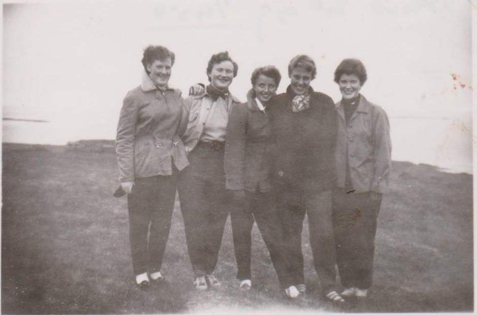 5 konur standa fyrir á mynd. Þetta eru Guðfríður Guðjónsdóttir, Sigríður Guðjónsdóttir, Systa Ragnarsdóttir, Rósa Jónída og Dísa á Heydalsá.