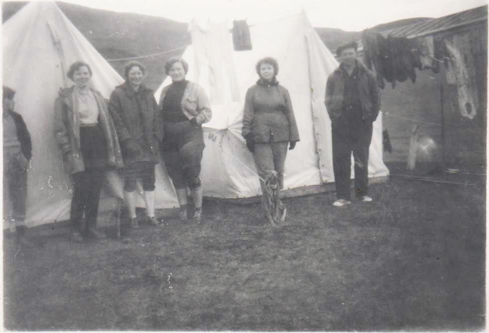 Aftan á mynd stendur "Við vegavinnutjöldin á Heydalsá? eftir íþróttaæfingu".