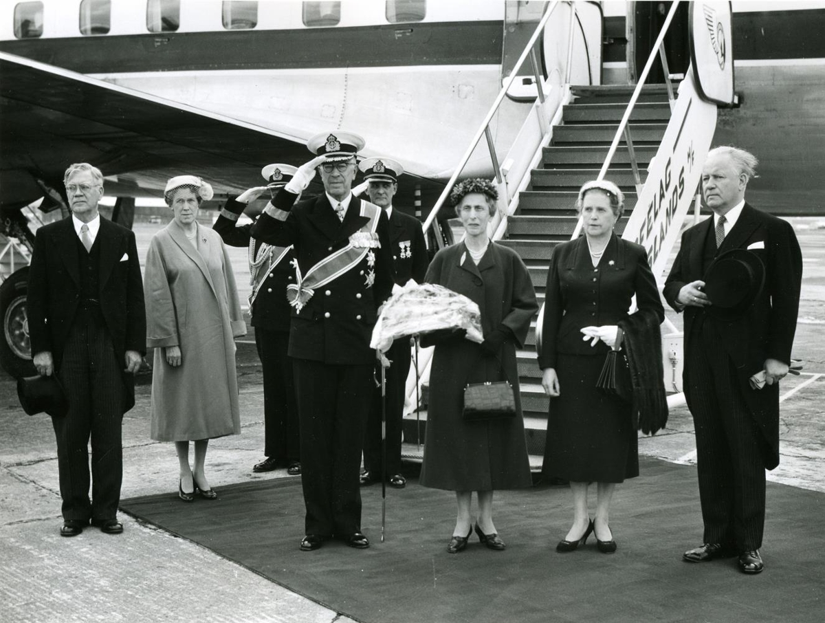 Úr forsetatíð Ásgeirs Ásgeirssonar. Tekið á móti Sænsku konungshjónunum á Reykjavíkurflugvelli. Fremst f.v. Gústav VI. Adolf konungur, Lovísa drottning Dóra Þórhallsdóttir og Ásgeir Ásgeirsson forseti.