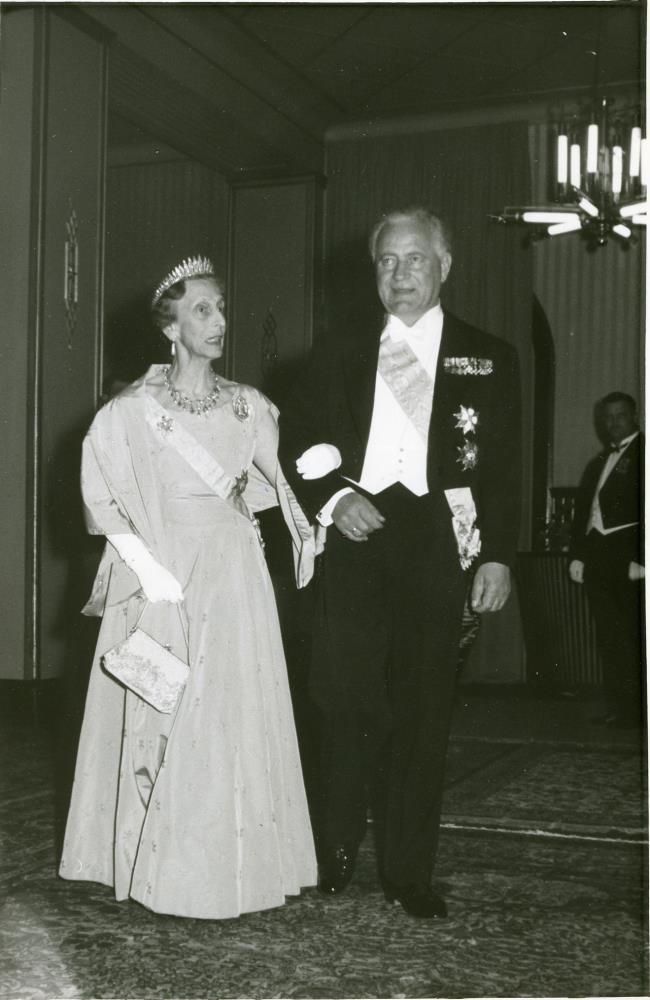 Úr forsetatíð Ásgeirs Ásgeirssonar. Lovísa Svíadrottning og Gustav VI. Adolf Svíakonungur í Gyllta sal Hótel Borgar.