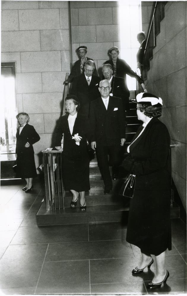 Úr forsetatíð Ásgeirs Ásgeirssonar. Konungshjónin, forsetahjónin og fylgdarlið þeirra skoðar Háskóla Íslands.