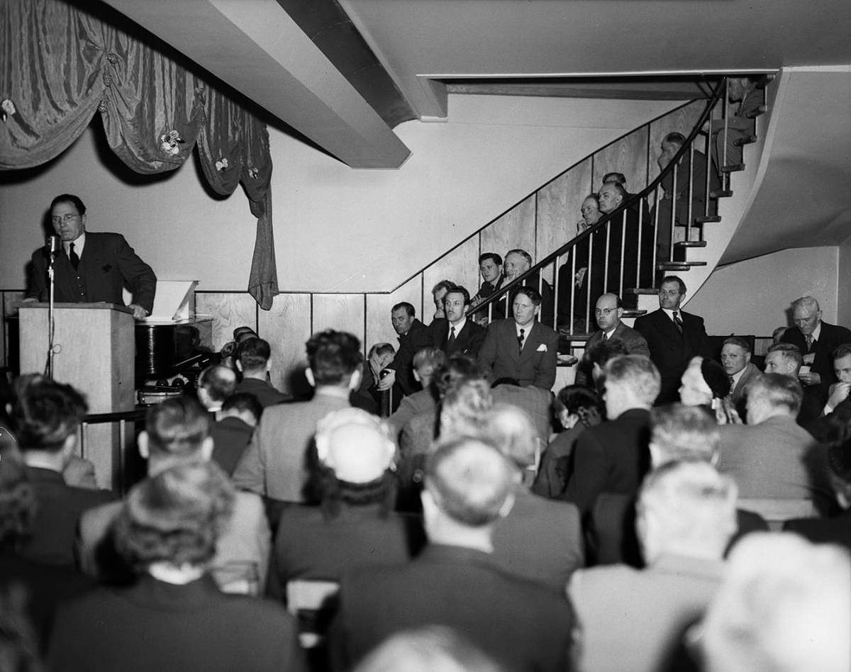 Kosningafundur B-listans. Breiðfirðingabúð. Reykjavík. Hermann Jónasson formaður í pontu. Við stiga f.v. Þráinn Valdimarsson, Daníel Ágústínusson, Sigtryggur Klemensson og Björn Guðmundsson. Heimildarmaður Vigdís Pálsdóttir. Sjá Tíminn 4.6.1953.