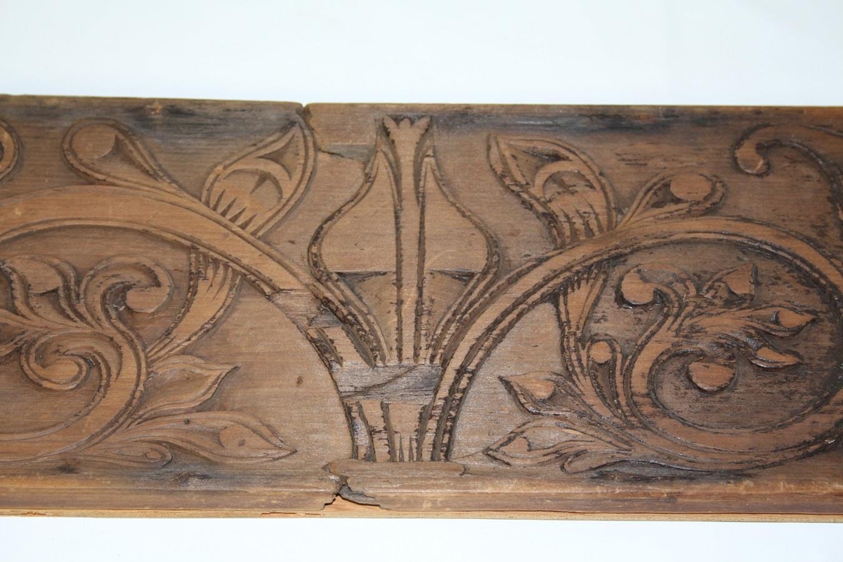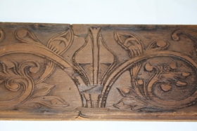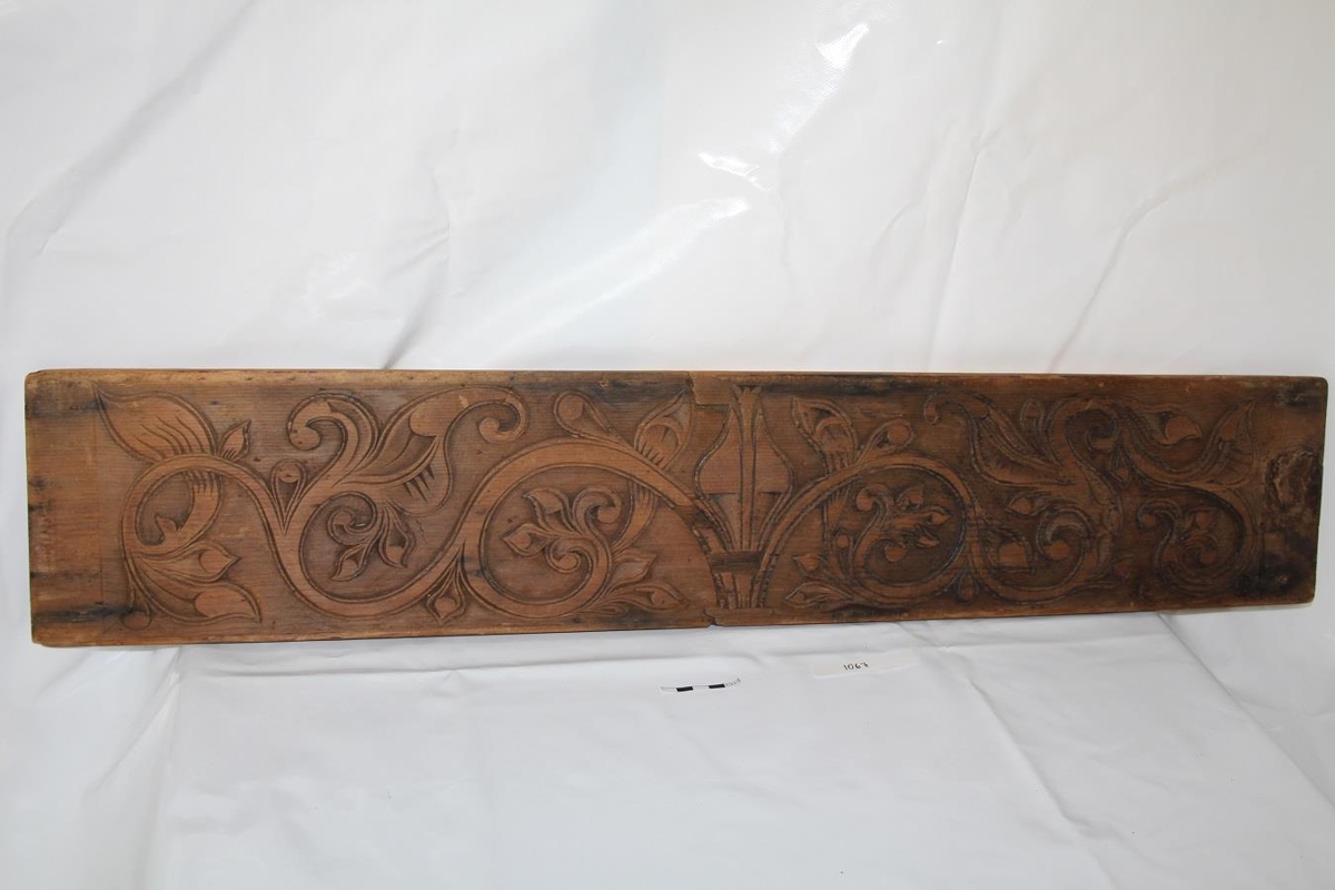 Útskorin fjöl frá Papey. Skafti sá hana þar brotna og fékk að gjöf hjá Gústafi Gíslasyni. Hún er nú viðgerð af Eymundi í Hjarðanesi.