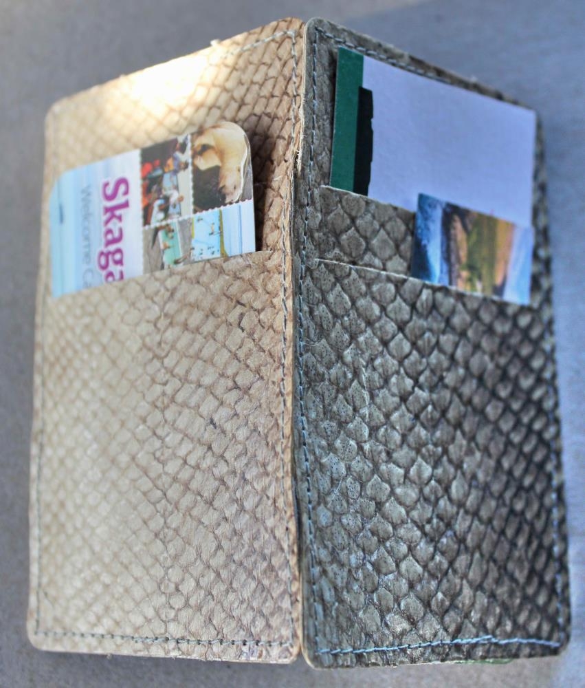 Kortaveski úr laxaroði. Stærð 11 x 7 cm. Tvö spjöld saumuð úr roði frá Sjávarleðri á Sauðárkróki á árunum 2005 - 2007. Litur grár. Bundin saman með gráum 1 cm breiðum silkiböndum. Spjöldin opnast á báða vegu vegna þess að böndin víxlleggjast, og eru saumuð á sitt hvort spjaldið.