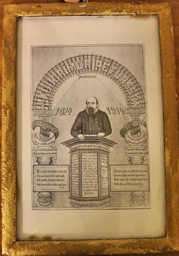 Innrömmuð mynd með prentmynd af Hallgrími Péturssyni (1614 - 1674), ramminn er gylltur, stærð 15,7 x 22,8 sm. Myndin er í gráum tónum, af Hallgrími Péturssyni í ræðustól og ártölin 1614 og 1914 sitt hvoru megin. Myndin var í eigu Ástu Maríusdóttir (1918 - 2007).