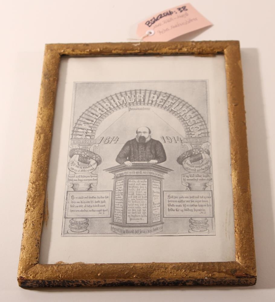 Innrömmuð mynd með prentmynd af Hallgrími Péturssyni (1614 - 1674), ramminn er gylltur, stærð 15,7 x 22,8 sm. Myndin er í gráum tónum, af Hallgrími Péturssyni í ræðustól og ártölin 1614 og 1914 sitt hvoru megin. Myndin var í eigu Ástu Maríusdóttir (1918 - 2007).