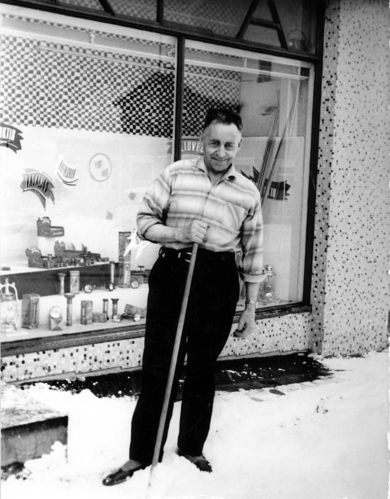 Jón Þórðarson (1896-1995) húsvörður að sópa snjónum fyrir utan búðarglugga "Járn og Gler" Hafnarstræti 91.