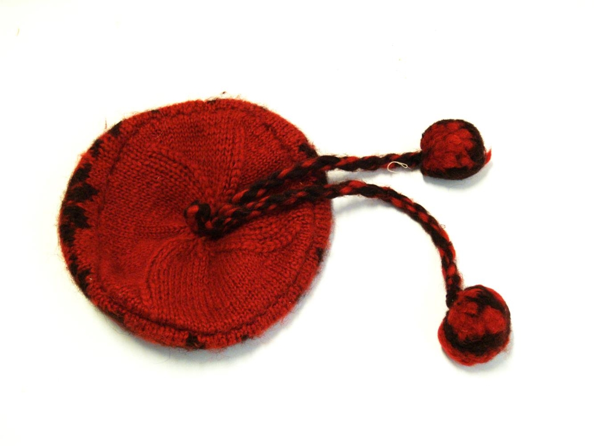 Húfa úr rauðum lopa, í barnastærð. Fanney Hannesdóttir prjónaði fyrir son sinn Brynjólf.