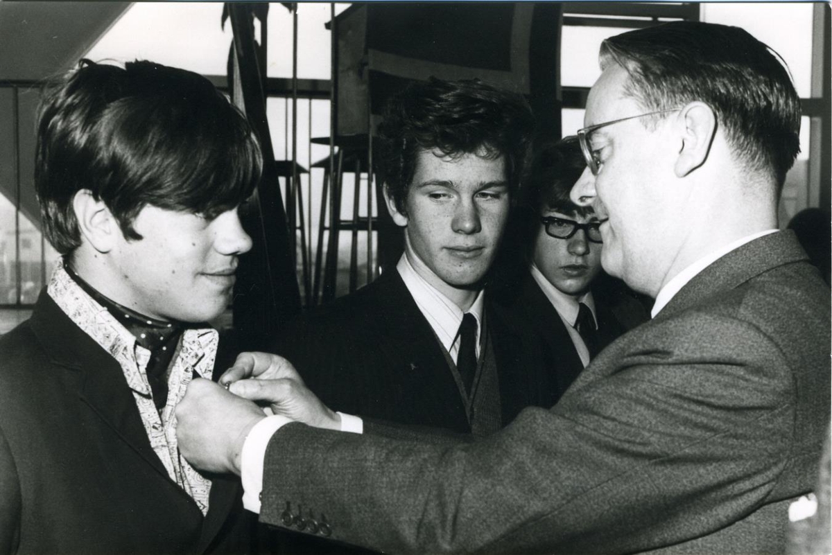 Í Vogaskóla. Gylfi Þ. Gíslason menntamálaráðherra festir barmmerki á nemendur.