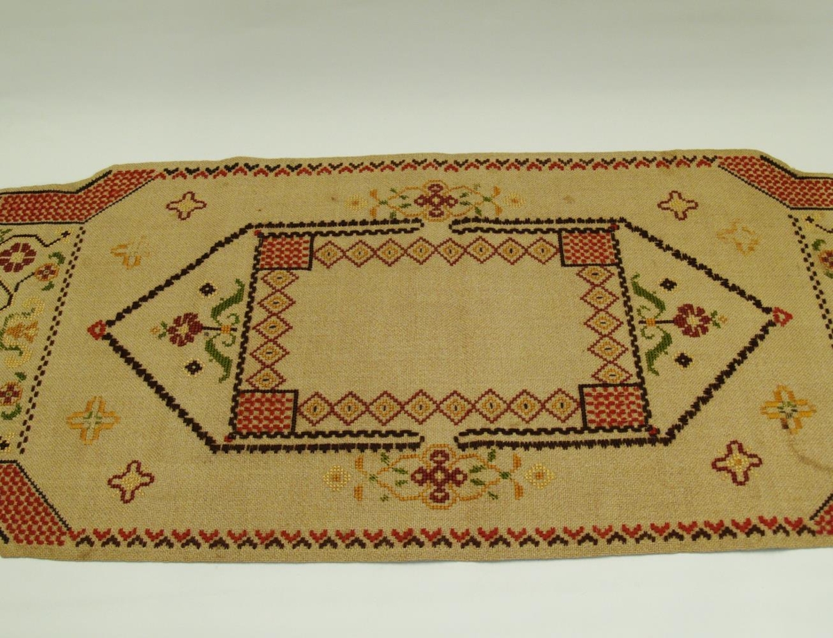 Brúnleitur dúkur með ísaum i mörgum litum.