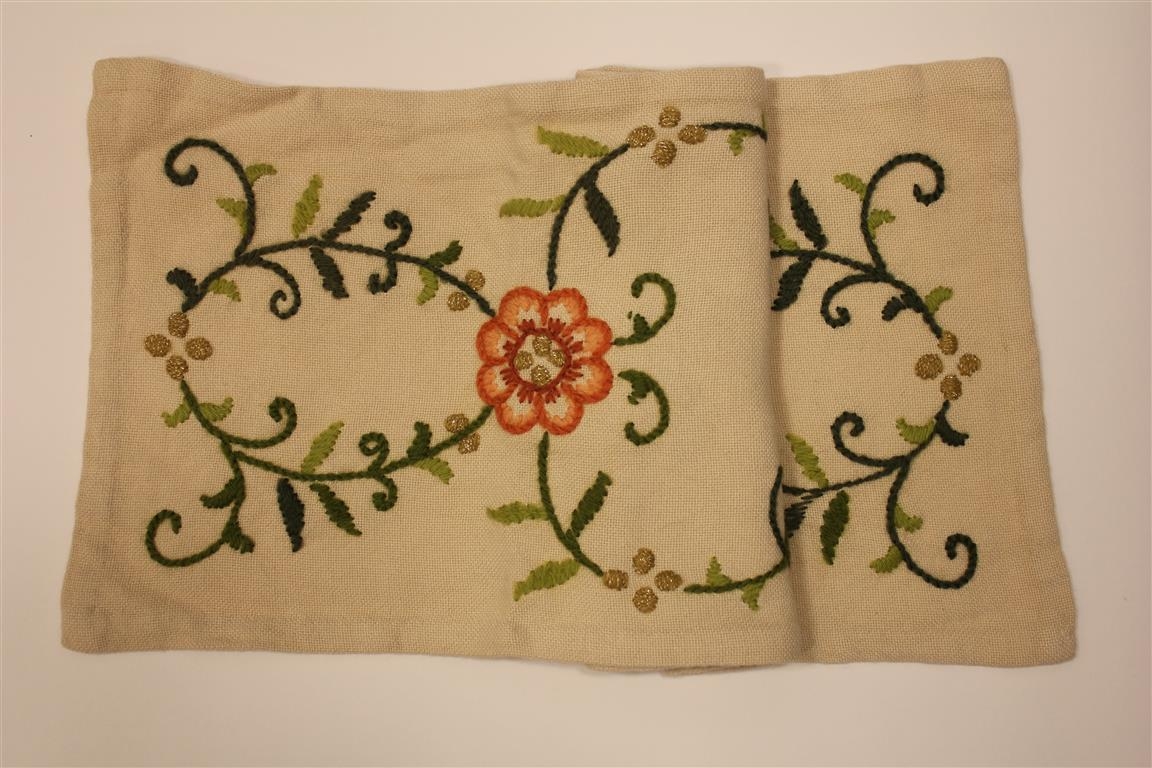 Útsaumaður borðrenningur, dúkur, blóm og laufvafningar.