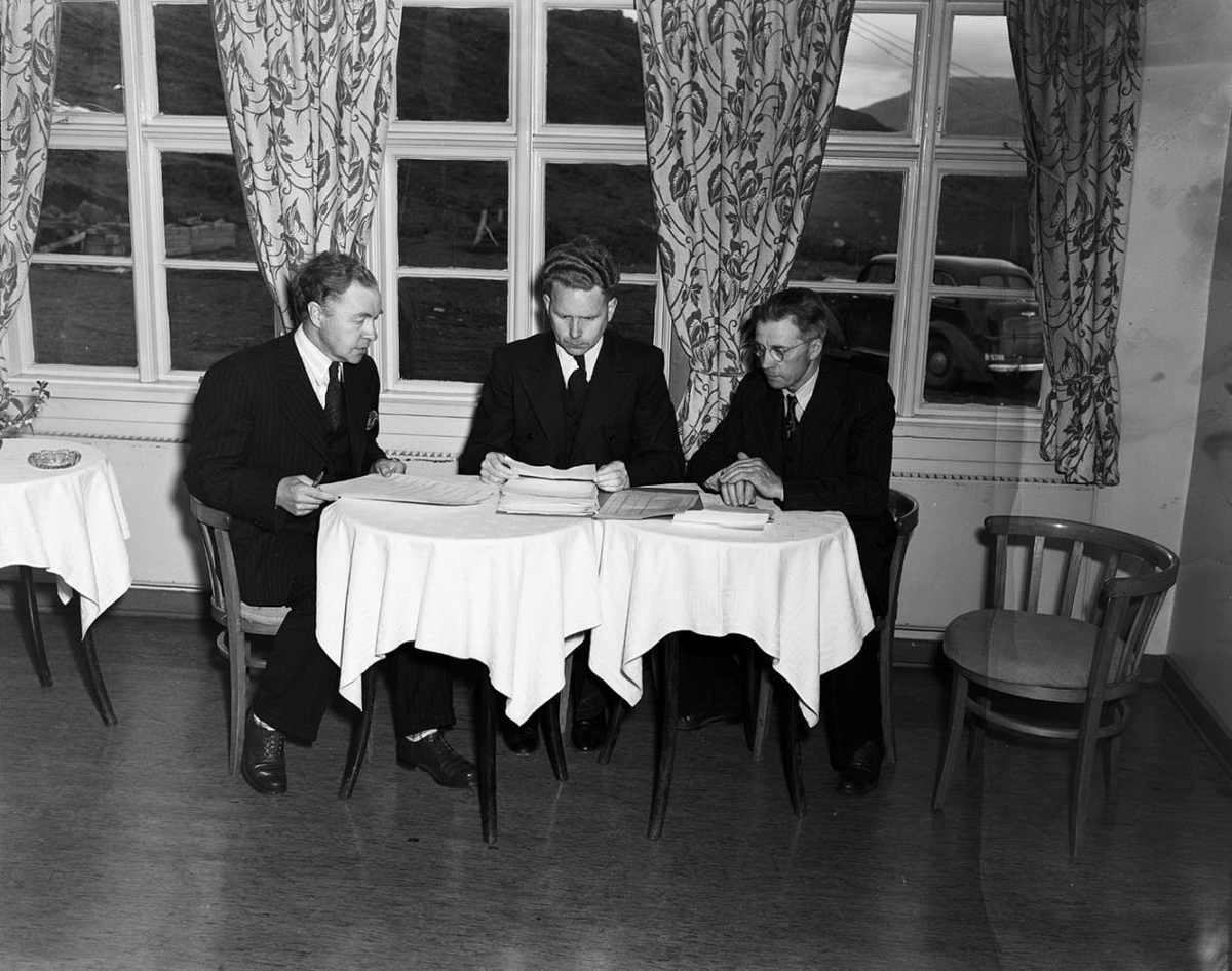 Valhöll. Þingvöllum. Aðalfundur SÍS 1947. Þrír menn sitja við borð með pappírsgögn fyrir framan sig. Kjörnefnd að störfum. Jón S. Baldurs, Hjörtur Hjartar og Sverrir Gíslason.
