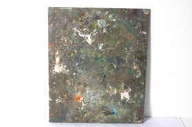 Litaspjald úr krossviði sem Jóhannes Kjarval notaði til að blanda liti. Spjaldið er notað beggja vegna.